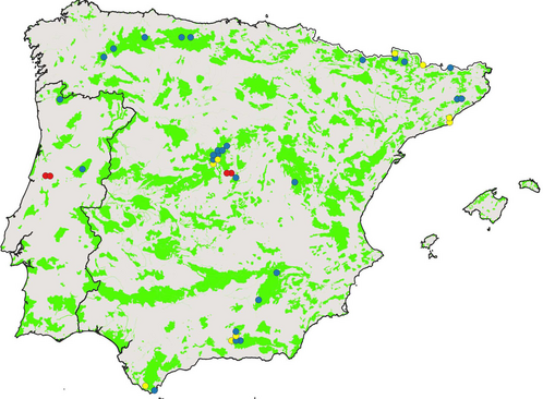 Áreas prioritarias para los artrópodos iberobaleares (Áreas Prioritarias para los Artrópodos Iberobaleares [APAI], es decir, celdas que son puntos calientes para al menos tres grupos taxonómicos. Las APAI protegidas por la red N2000 (>50%) están representadas en azul, las APAI marginalmente representadas en Red Natura 2000 (1%–50%) en amarillo y aquellas APAI fuera de la Red Natura 2000 (<1%) en rojo. La red Nat